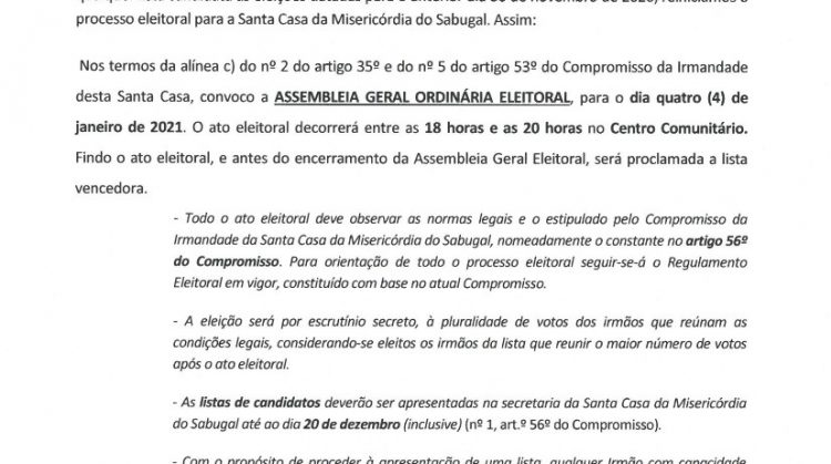 Convocatória 04/01/2021 Assembleia Geral de irmãos – 04-01-2021 A convocatória pode ser descarregada no menu Publicações ou aqui. Convocatória Suspensão Assembleia Eleitoral