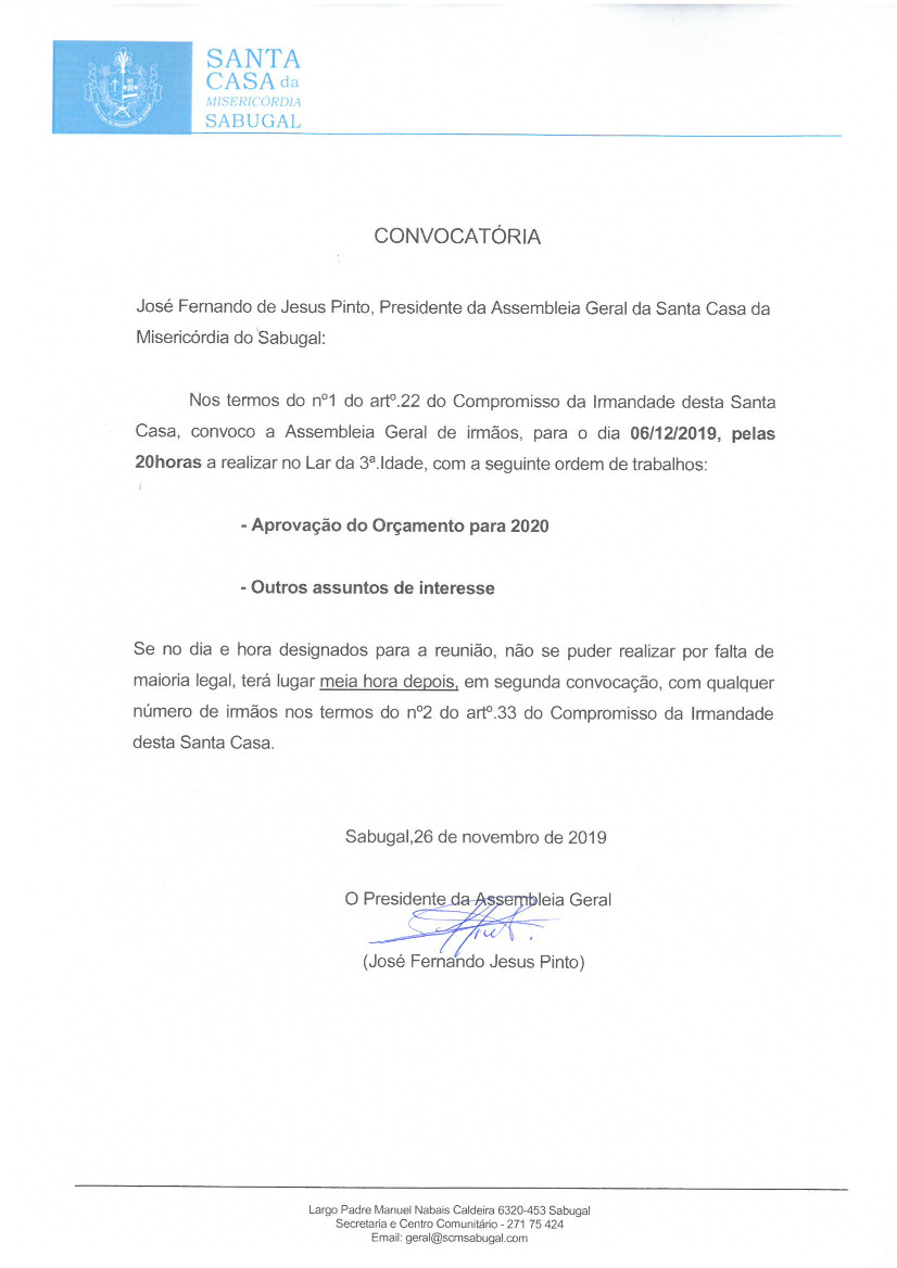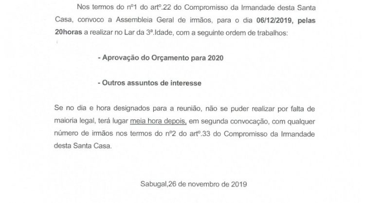 Convocatória Assembleia Geral de irmãos – 06-12-2019 A convocatória pode ser descarregada no menu Publicações ou aqui. Anúncio – Venda de Bens Convocatória 04/01/2021